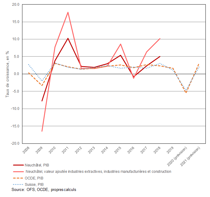 Le secteur manufacturier est le secteur le plus important dans le canton de Neuchâtel. Les industries extractives, les industries manufacturières et la construction contribuent presque à 50% de la valeur ajoutée neuchâteloise . Dans tous les autres cantons, excepté Bâle-Ville et le Jura, la contribution du secteur manufacturier est inférieure. De plus, ces secteurs dépendent fortement de la croissance de l’économie mondiale. C’est le facteur principal qui explique que l’économie neuchâteloise est fortement touchée par les fluctuations du commerce extérieur.