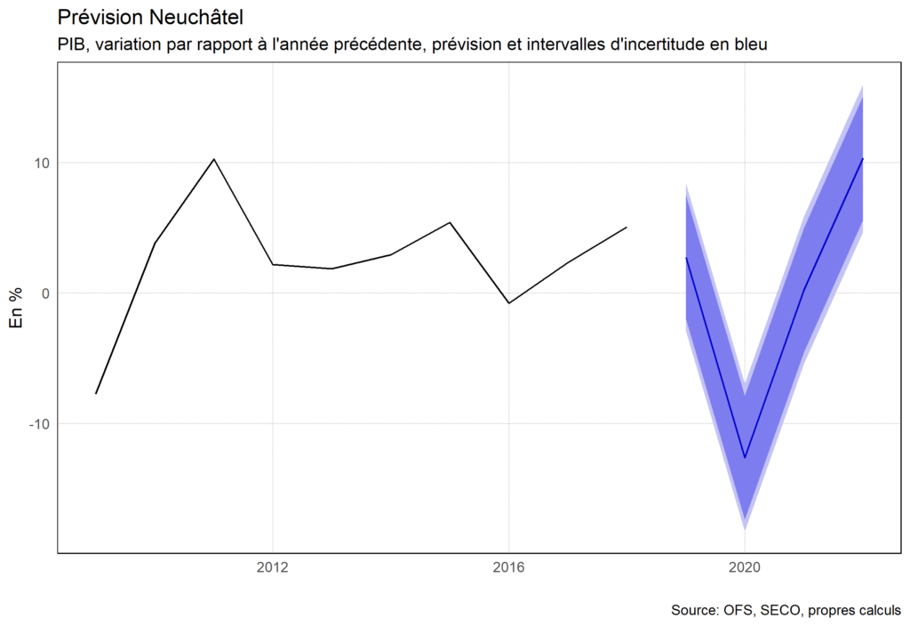 Les deux graphes ci-dessous contiennent les prévisions pour Neuchâtel. Vous voyez que selon le modèle, le PIB et la valeur ajoutée ont fortement baissé en 2020. En 2021, le modèle prévoit une stagnation. La croissance devient positive uniquement en 2022.