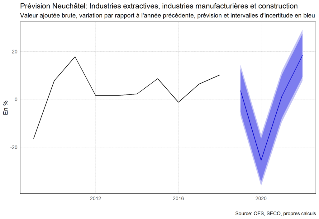 Mon modèle de prévision se base sur les chiffres du PIB pour la Suisse (qui sont déjà disponibles jusqu’à 2020) et les prévisions du PIB Suisse du SECO (pour 2021 et 2022). Ce modèle concerne la croissance du PIB et celle de la valeur ajoutée dans des industries extractives, industries manufacturières et construction dans le canton de Neuchâtel.