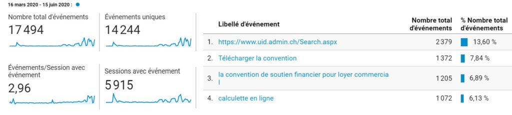 On observe deux grand pics, le premier, au début de la crise, lors du lancement du soutien pour les prêts sans intérêts dédiés aux petites entreprises ou aux indépendant.e.s et le deuxième le 4 juin, avant la prolongation du délai des aides à fonds perdu aux loyers des locaux commerciaux.