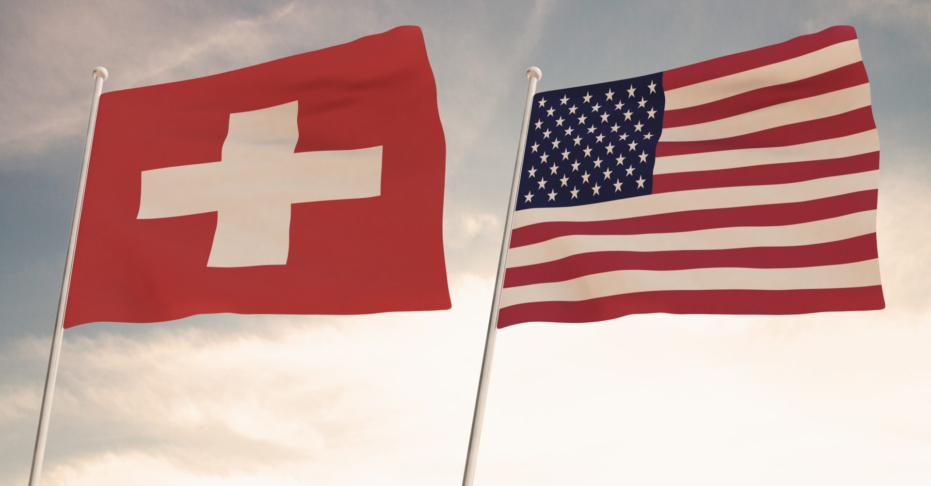 Relations between the countries of the United States of America USA and SWISS represented by the concept of two flags waving against a cloudy sky.3d render.